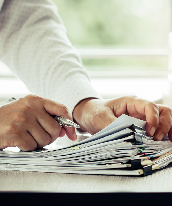 Businessman hands holding pen for working in Stacks of paper files searching information business report papers and piles of unfinished documents achieves on laptop computer desk in modern officeadcoonic2020-06-16T08:00:56+00:00